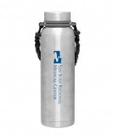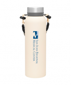 32 oz double wall 18/8 stainless steel thermal bottle with copper vacuum insulation, insulated stainless steel threaded lid, silicone ring, removable strap with buckles, removable clasps, and powder coated finish. Individual gift box. Hand wash recommended. Do not microwave. Complies with FDA, Prop 65. 11" H x 3.1875" W