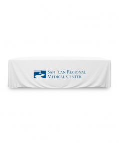 8 ft. Premium PolyKnit throw table cover with one color logo. Fits a 96 inch wide x 30 inch deep table. All corners are rounded meaning they will not gather and lay on the floor. Floor length on 4 sides. This cloth requires no ironing, is EasyCare machine washable and dryer safe.
